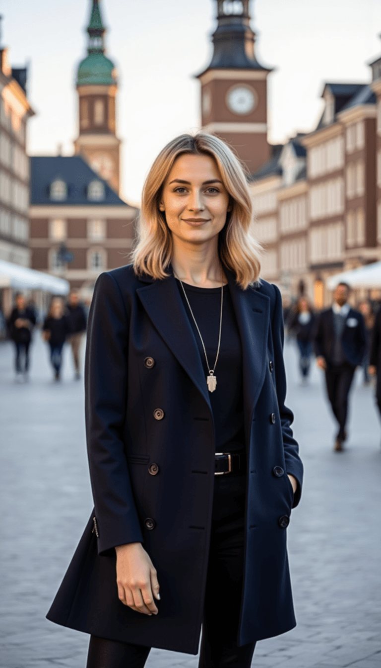Это фотография высокого разрешения, запечатлевшая человека, уверенно стоящего в самом сердце амстердамской площади Дам. Объект съемки расположен в центре, в обрамлении культовой архитектуры Королевского дворца и Новой церкви (Nieuwe Kerk), которые образуют впечатляющий, но гармоничный фон. Современный наряд – приталенное пальто темно-синего цвета в сочетании с элегантными минималистичными аксессуарами – дополняет городскую изысканность сцены. Высокий ключ освещения заливает площадь четким, сияющим светом, устраняя резкие тени и подчеркивая чистые линии композиции. Снятый на Sony A1 с объективом 70-200mm f/2.8 на 200mm, снимок отличается невероятной резкостью, с глазами объекта в идеальном фокусе, излучающими чувство целеустремленности и ясности. Общее настроение – сдержанная элегантность, сочетающая вневременное очарование Амстердама с современной профессиональной эстетикой.