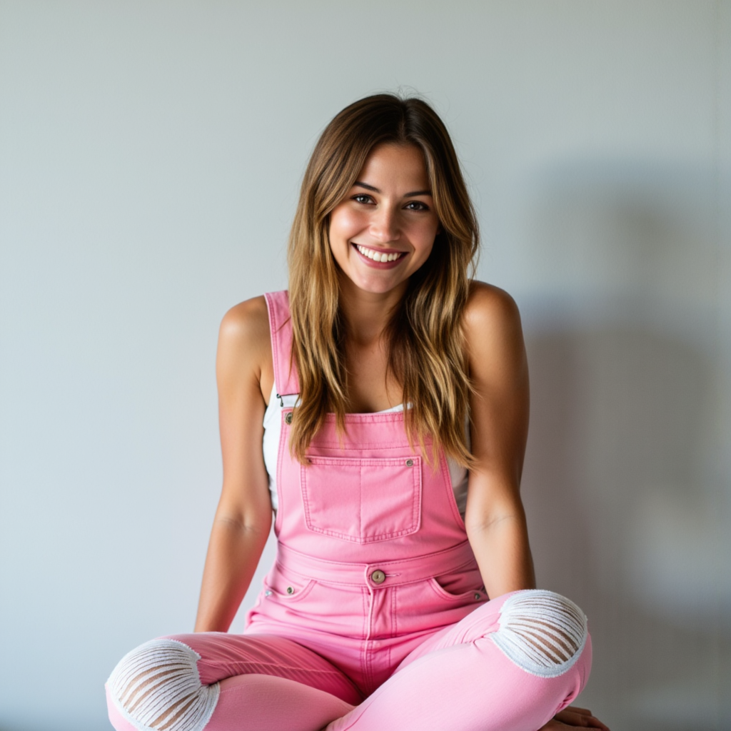 Высококачественная цветная фотография запечатлела молодую женщину в ярко освещенной студии. Ее лицо расслабленное и радостное, искренняя улыбка расплывается по ее губам, глаза светятся легким задором, напоминающим о празднике. На ней надет ярко-розовый джинсовый комбинезон с за playful тканевыми нашивками на коленях, текстура которых видна благодаря детальной фокусировке. Непринужденный, удобный стиль подчеркивается скрещенными ногами – позой легкости и удовлетворенности. Студийный фон прост и чист, гладкая светло-серая стена служит нейтральным холстом, позволяя объекту съемки и ее яркой одежде быть в центре внимания. Освещение мягкое и рассеянное, как утренний свет, проникающий через большое окно, бросающий мягкое сияние, подчеркивающее детали денима и ее кожи без резких теней. Композиция в целом сцентрирована и сбалансирована, создавая спокойный и располагающий портрет с отчетливо игривым и расслабленным настроением. Точная экспозиция обеспечивает четкое и глубокое воспроизведение каждого оттенка розового комбинезона и едва заметных перепадов света.