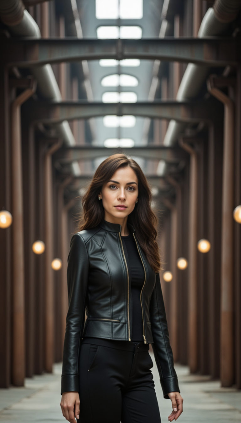 Это фотография высокого разрешения, запечатлевающая человека, стоящего в огромном промышленном пространстве с симметричными металлическими конструкциями. Центральная фигура, расположенная в центре кадра, смотрит прямо в камеру со спокойным, уверенным видом. На ней надет стильный, современный наряд — приталенная черная куртка с едва заметными металлическими акцентами в сочетании с классическими брюками. Фон представляет собой возвышающиеся стальные балки и трубы, расположенные в идеальной симметрии, создавая поразительный геометрический узор. Текстуры ржавого металла и гладких поверхностей резко контрастируют. Естественный свет льется из высоких окон, отбрасывая мягкое, рассеянное освещение, которое подчеркивает объект, создавая при этом мягкий эффект боке на заднем плане. Снятая на Sony A1 с использованием объектива 24-70mm f/2.8, фотография использует селективный фокус для изоляции человека, улучшая глубину и подчеркивая индустриальные текстуры. Композиция с дальнего плана усиливает ощущение масштаба, помещая фигуру в величие окружающей среды. Общее настроение – современная элегантность, сочетающая в себе грубую красоту индустриальных элементов с утонченной эстетикой объекта. Изображение передает творческую и мощную атмосферу, балансируя силу и безмятежность.