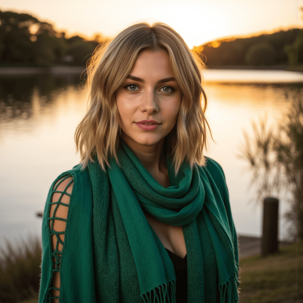 Портретная фотосессия у озера, где модель расположена близко к камере и смотрит прямо в объектив. На ней изумрудная шаль ручной работы с деликатной бахромой, которая улавливает свет золотого часа. На заднем плане – безмятежное озеро с легкими волнами, отражающими теплые цвета заката. Береговая линия украшена тонкими камышами и деревянным причалом, уходящим в воду. Снято на Canon EF 85mm f/1.2L с открытой диафрагмой, создающей эффект мечтательного боке, смягчающего дальнюю линию деревьев. Естественная виньетка привлекает внимание к выражению лица модели, а низкий угол съемки позволяет запечатлеть и модель, и простирающийся за ней водный пейзаж. Освещение создает мягкий контровой свет вокруг силуэта, подчеркивая текстуру сложного плетения шали.