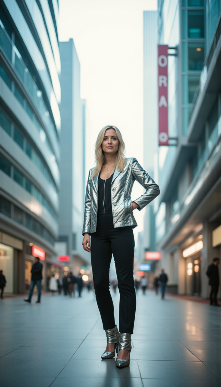 Это фотография высокого разрешения, запечатлевающая человека, стоящего в футуристическом городском районе, залитом неземным светом контрового освещения. Центральная фигура расположена слегка не по центру, обращена к камере с собранным и уверенным выражением лица. На ней надет элегантный, современный наряд — приталенная металлическая куртка с угловатыми линиями и брюки с высокой талией, в сочетании с минималистичными аксессуарами, отражающими футуристическую тематику. На заднем плане возвышаются небоскребы с отражающими стеклянными поверхностями, чьи геометрические формы резко очерчены на фоне сумеречного неба. Неоновые вывески и голографические рекламные объявления отбрасывают яркие оттенки бирюзового и пурпурного, создавая динамичную игру света. Контровое освещение, напоминающее сияние далекой сверхновой, обрисовывает силуэт фигуры мягким, золотым нимбом, а токсично-лаймовые блики танцуют по краям ее силуэта. Текстура сцены представляет собой контраст полированной стали и матового бетона, с легкими полосами дождя, придающими земле глянцевый блеск. Композиция снята на Canon EOS R5 с использованием объектива 70-200mm f/2.8, обеспечивающего большую глубину резкости для акцента на сложных деталях как объекта, так и окружающей среды. Средний план идеально обрамляет человека в пределах городского простора, создавая баланс между интимностью и величием. Общее настроение — парадоксальное сочетание безмятежного футуризма и электрического напряжения, вызывающее чувство вневременной элегантности в ультрасовременном мире.