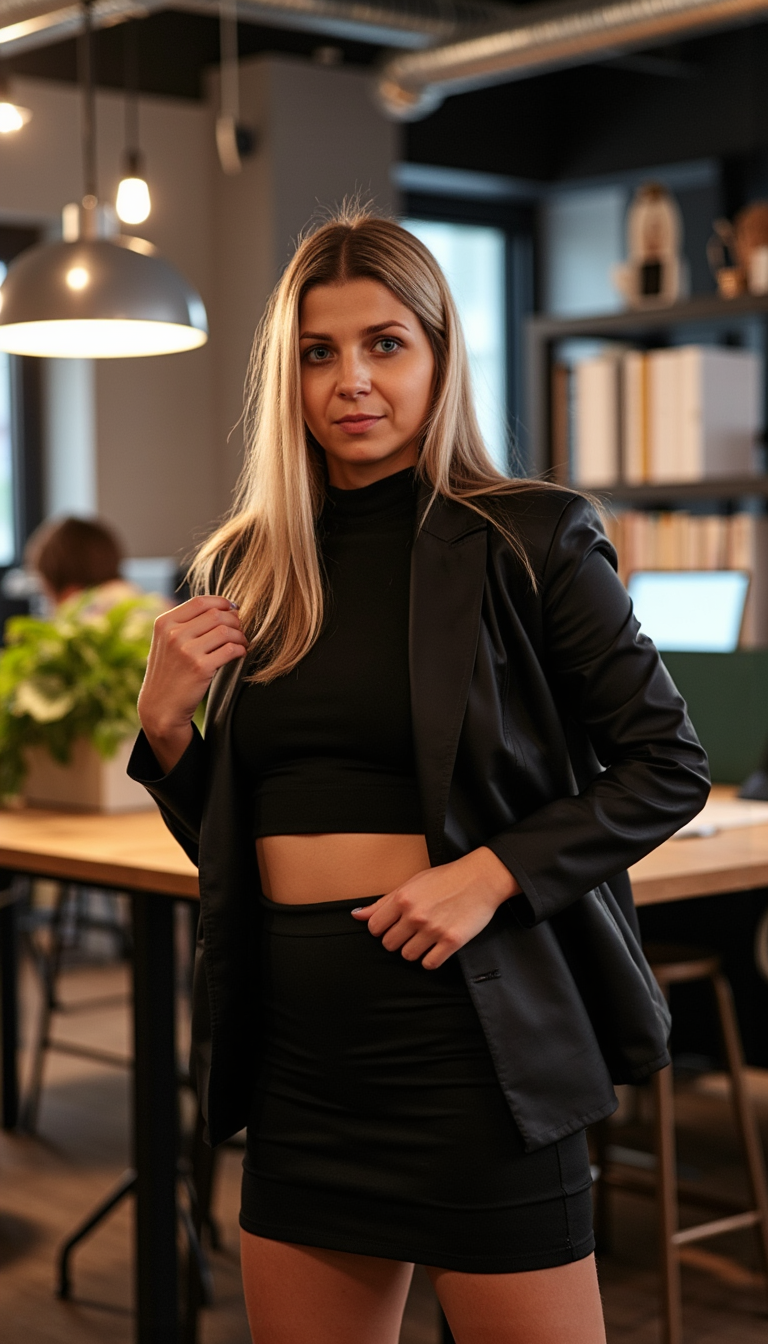 Объект съемки запечатлен в стилизованной модной позе, органично интегрированной в окружающую среду. Мягкое окружающее освещение заливает сцену, отбрасывая естественные тени, которые подчеркивают черты лица модели и ее одежду. Камера Canon EOS R5 в сочетании с объективом 85mm f/1.4 обеспечивает малую глубину резкости, достигая кинематографичного фокуса, который слегка размывает фон, привлекая внимание зрителя к четко отображенному объекту съемки. Градиентный фон, тщательно подобранный для этой цели, усиливает атмосферу изысканности, обеспечивая плавный тональный переход, который дополняет одежду и тон кожи модели. Общий эффект выглядит отточенным и утонченным, вызывая ощущение сдержанной элегантности и намеренного художественного направления.