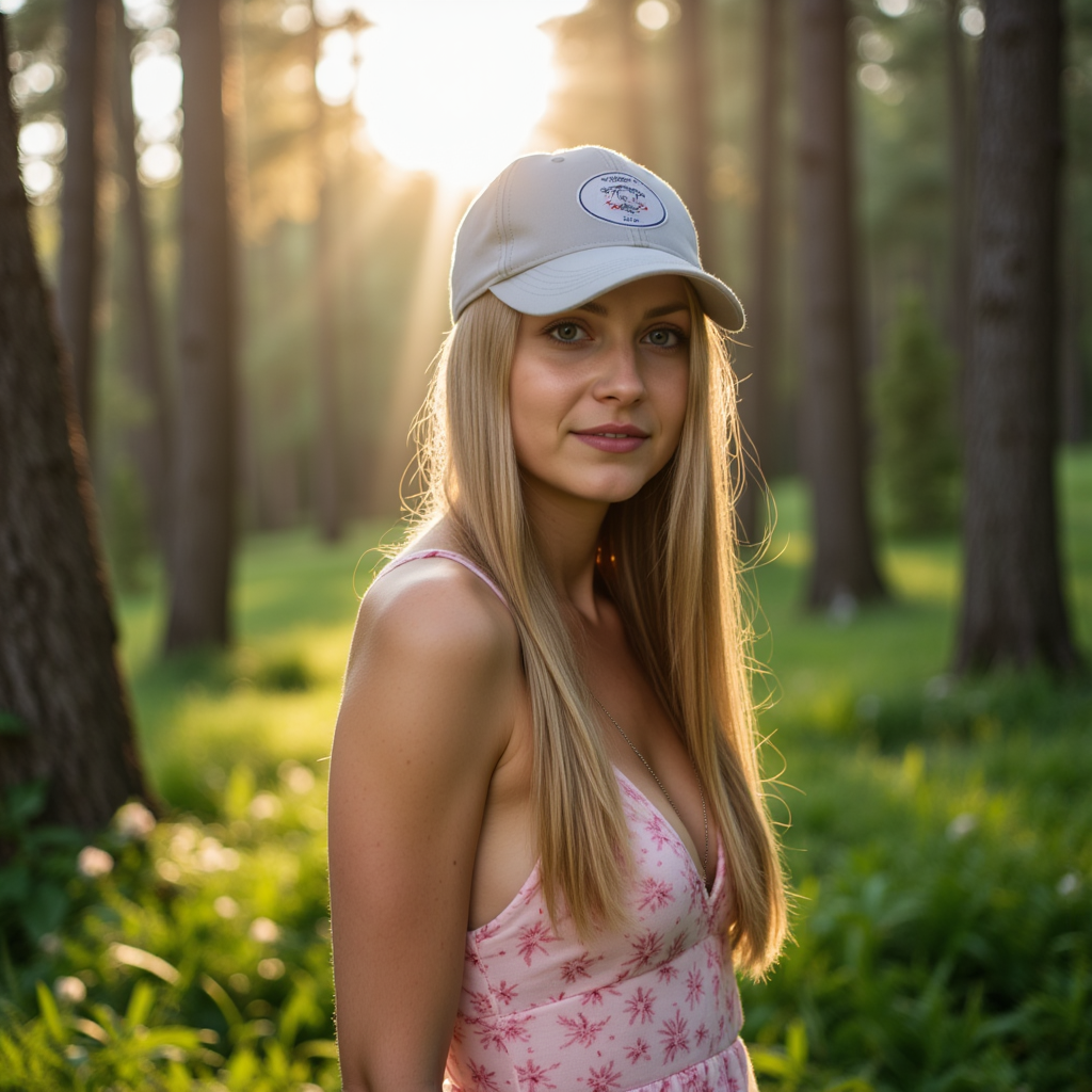Завораживающий лесной портрет, на котором запечатлен объект, стоящий близко к камере и смотрящий прямо, с вовлекающим взглядом. На нем надето нежное розовое пастельное цветочное летнее платье с полупрозрачным слоем, который ловит пятнистый солнечный свет, пробивающийся сквозь высокие сосны. Бейсболка с выцветшим логотипом отбрасывает легкие тени на лицо, дополняя непринужденную, но романтичную эстетику. Место действия — пышный, зеленый лес с богатым зеленым подлеском и разбросанными полевыми цветами, создающими естественный фон. Лучи света золотого часа пронизывают кроны деревьев, создавая эффектные световые акценты с четкими, определенными краями на лесной подстилке и подчеркивая черты лица объекта. Небольшая глубина резкости, достигнутая с помощью объектива 35mm prime с диафрагмой f/1.8, размывает дальние деревья в мечтательное боке, сохраняя при этом четкий фокус на выражении лица объекта, создавая кинематографичную, интимную атмосферу со смелым, напористым настроением.