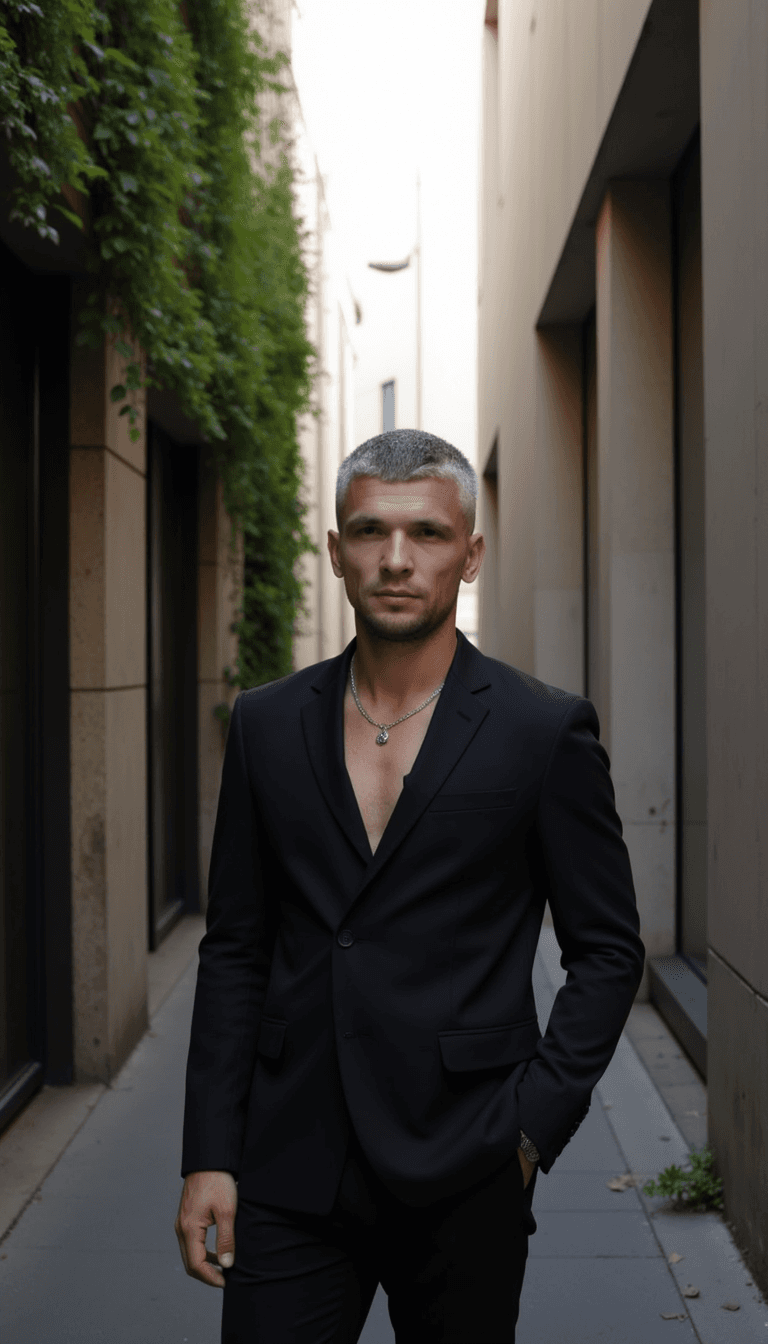 **Описание:** Это фотография высокого разрешения, запечатлевающая человека, стоящего на современном парижском мосту, с едва заметной Эйфелевой башней на заднем плане. Центральная фигура расположена точно в центре кадра, лицом к камере, в уверенной, но расслабленной позе. Человек одет в современный, сшитый на заказ костюм — элегантный черный тренчкот с четкими линиями в сочетании с темными брюками и начищенными кожаными ботинками. Мягкий шарф угольно-серого цвета небрежно накинут на шею, добавляя нотку элегантности. Задний план намеренно размыт, создавая художественную глубину резкости, которая подчеркивает объект, мягко рассеивая шумный городской пейзаж и силуэт башни. Освещение контровое, солнце находится чуть позади фигуры, отбрасывая сияющий ореол по краям и создавая нежное свечение на волосах и плечах. Тени мягкие и вытянутые, что придает композиции драматичность и современность. Общая атмосфера реалистичная, но кинематографичная, сочетающая в себе вневременную красоту Парижа с современной, безупречной эстетикой. Изображение передает настроение изысканного городского спокойствия, улавливая суть современной элегантности в культовой обстановке.