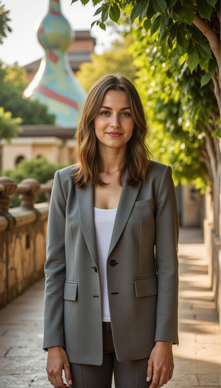 Это фотография человека, стоящего в самом сердце парка Гуэль, Барселона, на фоне знаменитых мозаичных стен и плавных архитектурных изгибов. Композиция представляет собой снимок в полный рост, запечатлевающий объект в элегантном, современном наряде — зауженных черных брюках и серебристой куртке с металлическим блеском, контрастирующем с причудливым, историческим фоном. Студийное освещение создает четкий свет, подчеркивающий уверенную позу объекта и сложную текстуру плиточной поверхности парка. Объектив 24-70mm f/2.8 создает мягкий фокус, размывая дальнюю зелень и детали мозаики до мечтательной дымки, подчеркивая при этом четкую, технологичную эстетику объекта. Холодные, современные тона наряда гармонируют с яркими, землистыми цветами парка, создавая ощущение футуристической элегантности в вечном окружении. Настроение — это сочетание инноваций и красоты, ощущение, будто технологии и искусство сосуществуют в идеальном балансе.