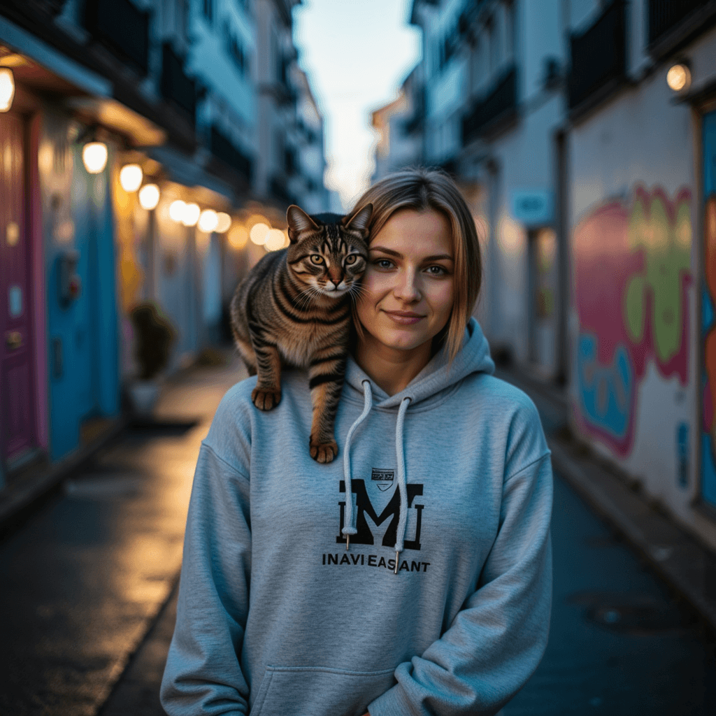 Крупный план человека в сером объемном худи с выцветшим логотипом, смотрящего прямо в камеру с расслабленным, задумчивым выражением лица. На его плече удобно устроился элегантный домашний кот с выразительными глазами, слегка прижавшийся к шее. Они стоят в узком переулке, расписанном граффити, с мокрым тротуаром, отражающим окружающие уличные фонари. Вечерняя обстановка создает мягкие сине-фиолетовые тона по всей сцене, с нежными бликами на лице объекта от кольцевой лампы, создающей легкое свечение. Водные лужи на земле отражают красочные отражения от окружающего городского искусства. Снято объективом Sony 50mm f/1.2 на f/2.0, обеспечивающим резкий фокус на лице объекта, в то время как яркий фон с граффити переходит в кремовое боке.